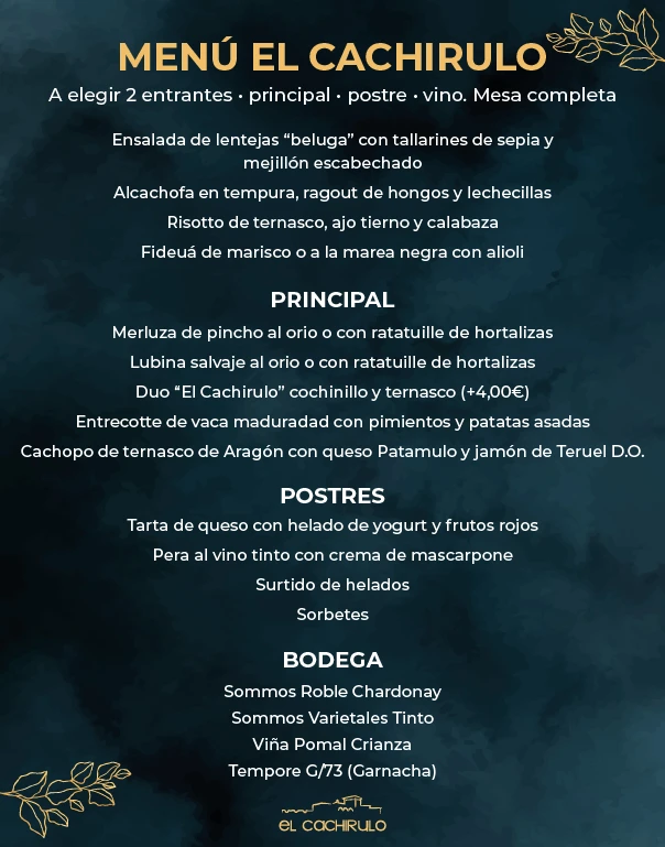• La persona que reciba el Bono Regalo debe reservar mesa por teléfono en el número 976 460 146 indicando el número de referencia de su Bono Regalo o bien mediante el siguiente enlace https://elcachirulo.es/restaurante/.